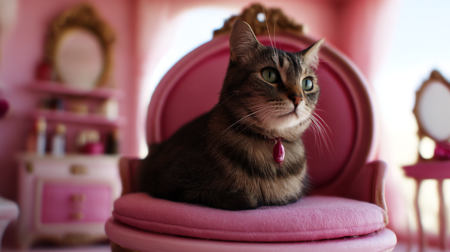 a cat in the pink room --no white cat --chaos 100 --ar 16:9 --weird 1000