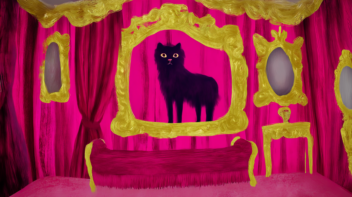 a cat in the pink room --chaos 100 --ar 16:9 --weird 1000